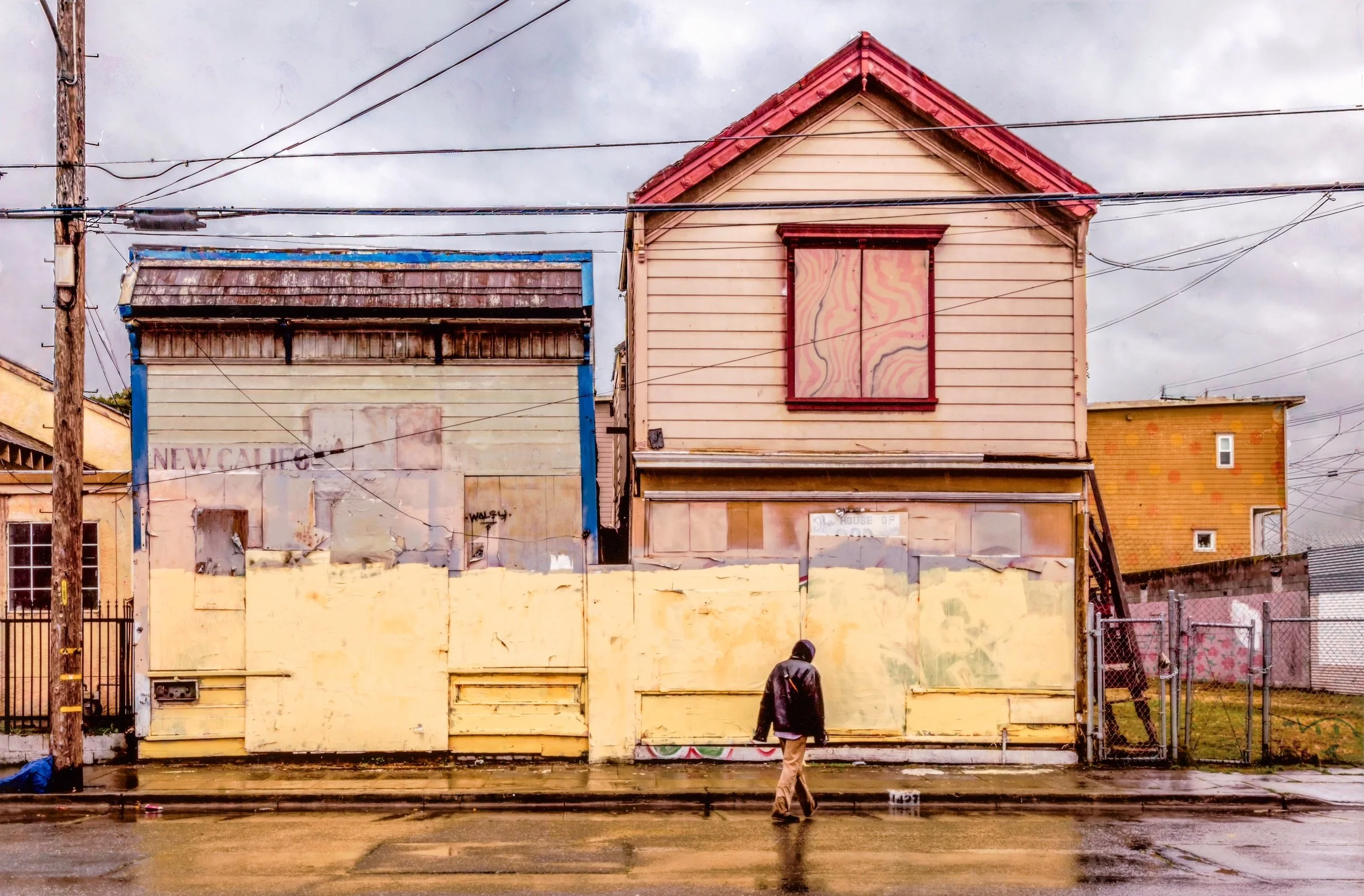 My studio is located in West Oakland, so I drive though the neighborhood daily. The multilayered surfaces of the buildings, alternating between paint and graffitti, are a fit for the process I work with in this series. A clear sheet of film is printed with with a photographic image , and attached to a sheet of BFK Rives printmaking paper. I paint the reverse side of the film with acrylics, and add chalk pastel, pencil and collage to the paper layer below. The combination of the two layers creates the final image.