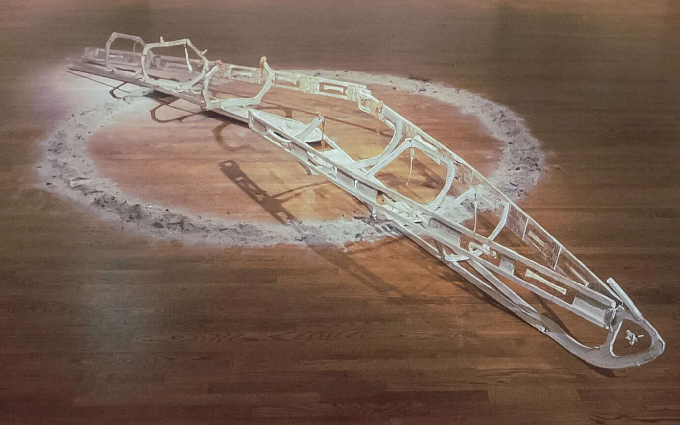 Bone Boat (for Barry), wood, acrylic paint, hand-carved text, bone, ash, 18” x 216” x 60”, 1991, (I made this piece in memoriam for artist, friend and Positive Art member Barry Frederick.)