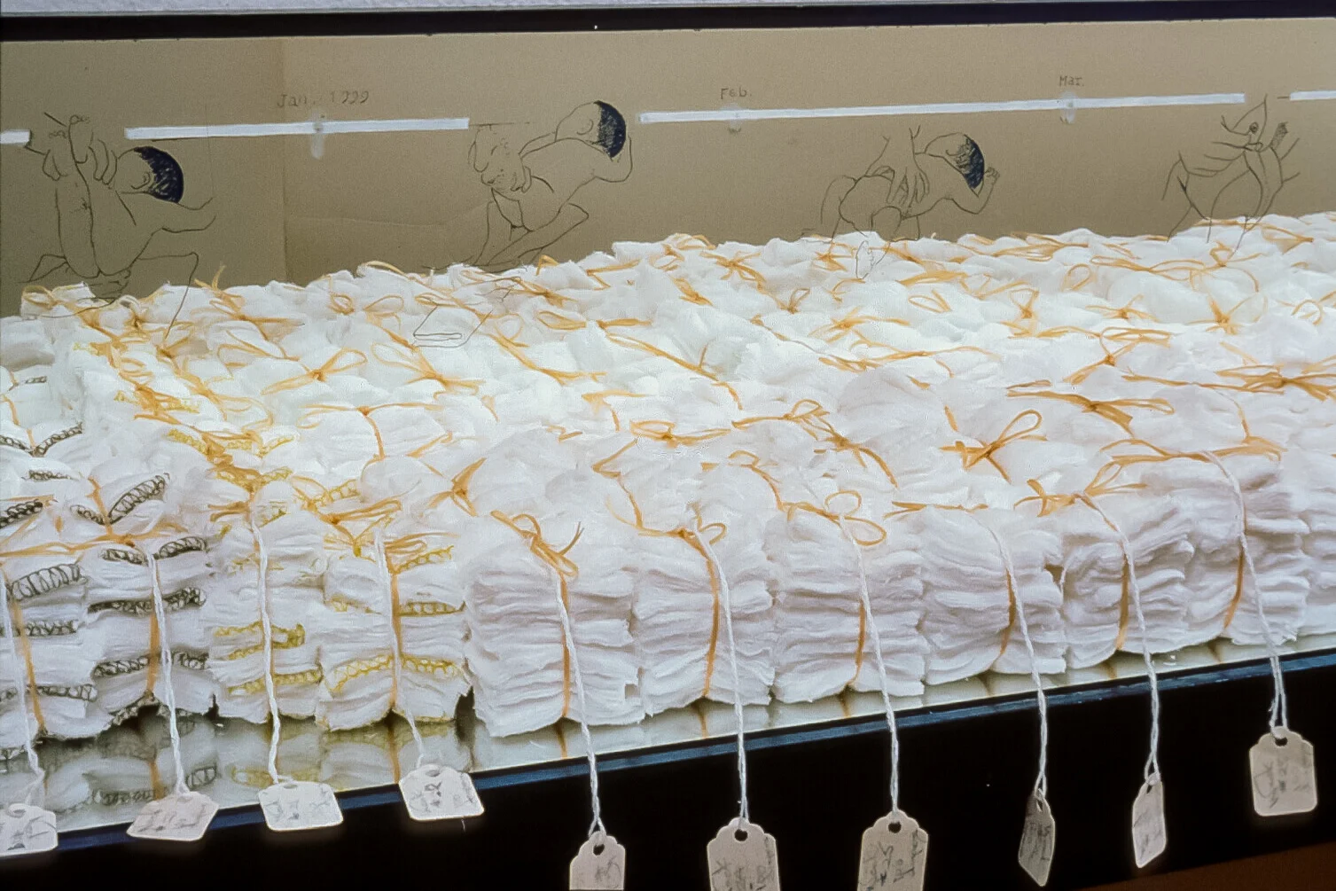 Meditation, (detail of larger piece) 5336 used cotton diaper swatches, drawings etched into salvaged mirror, wood, acrylic paint, waxed linen, paper tags, 18"x 96"x 10", 2001, (A process piece that is a journal of the first year of changing cloth diapers. At the end of each week, a single cloth diaper was cut into swatches, bundled and labeled to represent the amount of diapers changed for twin girls that week. This was done for one full year and is one part of a project entitled Baby, Baby!)