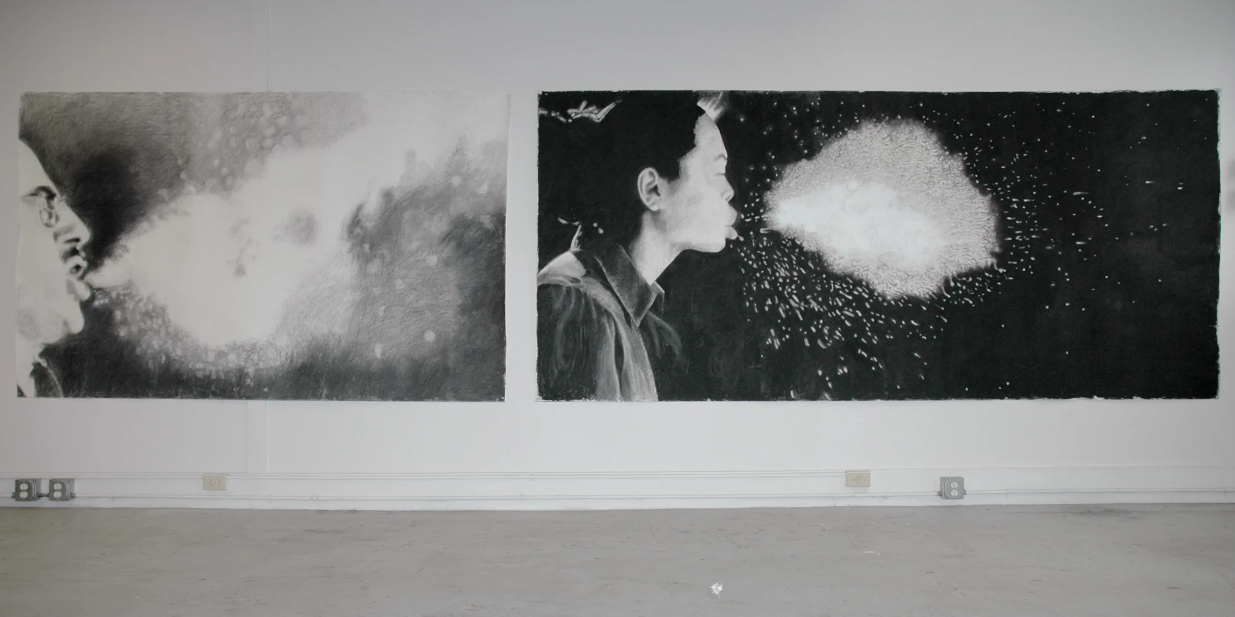 Enemies Too Small to See # 1 and #3, (partial installation view), charcoal on paper, 60” x 192”, 2013-2015, (From a larger project of monumental drawings addressing environmental issues and the body, by looking at both the chemical toxins in all of our bodies and the drug resistant new viruses that we are creating. A detail of these drawings reveals the hundreds of chemicals that live within us.)